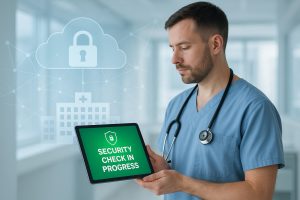A physician is looking at a tablet while a security check is performed.